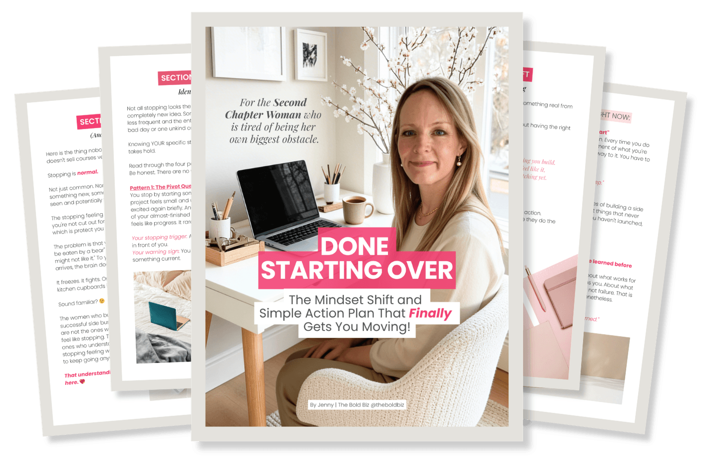 Done Starting Over is a FREE guide with the mindset shift and simple action plan that helps Second Chapter Women stop getting in their own way, and start building for real. Takes about 10 minutes.